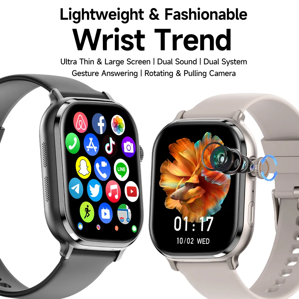 Technology enthusiast scenario: Explore the application ecosystem of productivity (calendar, notes) and entertainment (music, video). The rotating camera and eSIM technology showcase cutting-edge wearable innovation.