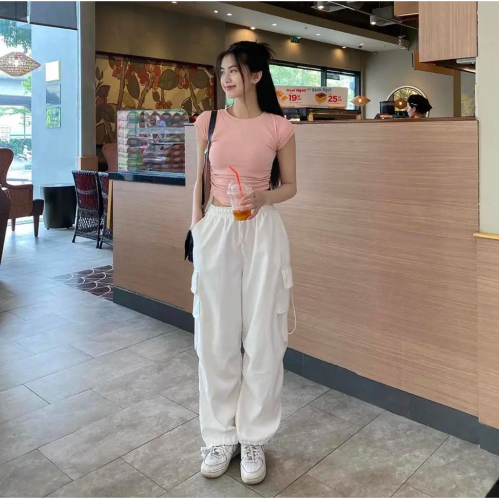 Color: white and pink Material: khaki True to description: true The product is beautiful, even though the shop advises size L, I have decided to choose XL and the truth is still very beautiful. Just go up 1 size if you want to wear baggy!