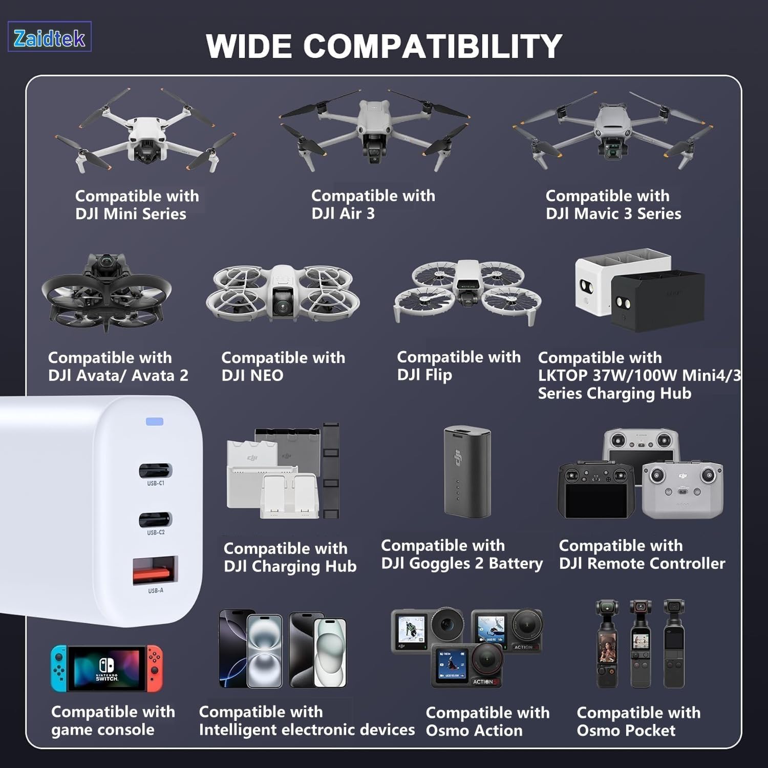 - Zaidtek 65W GaN Charger Compatible with DJI Mini Series/Air 3/Air 3S/Mavic 3 Series/Mini 4K/Avata Series/Neo/Flip Drone, DJI Remote Controller, DJI Avata, DJI Goggles 2, Osmo Pocket, Osmo Action 3/4, LKTOP Charging Hub, DJI Charging Hub, DJI remote controller, mobile phones, Ipad and other devices with USB-C port